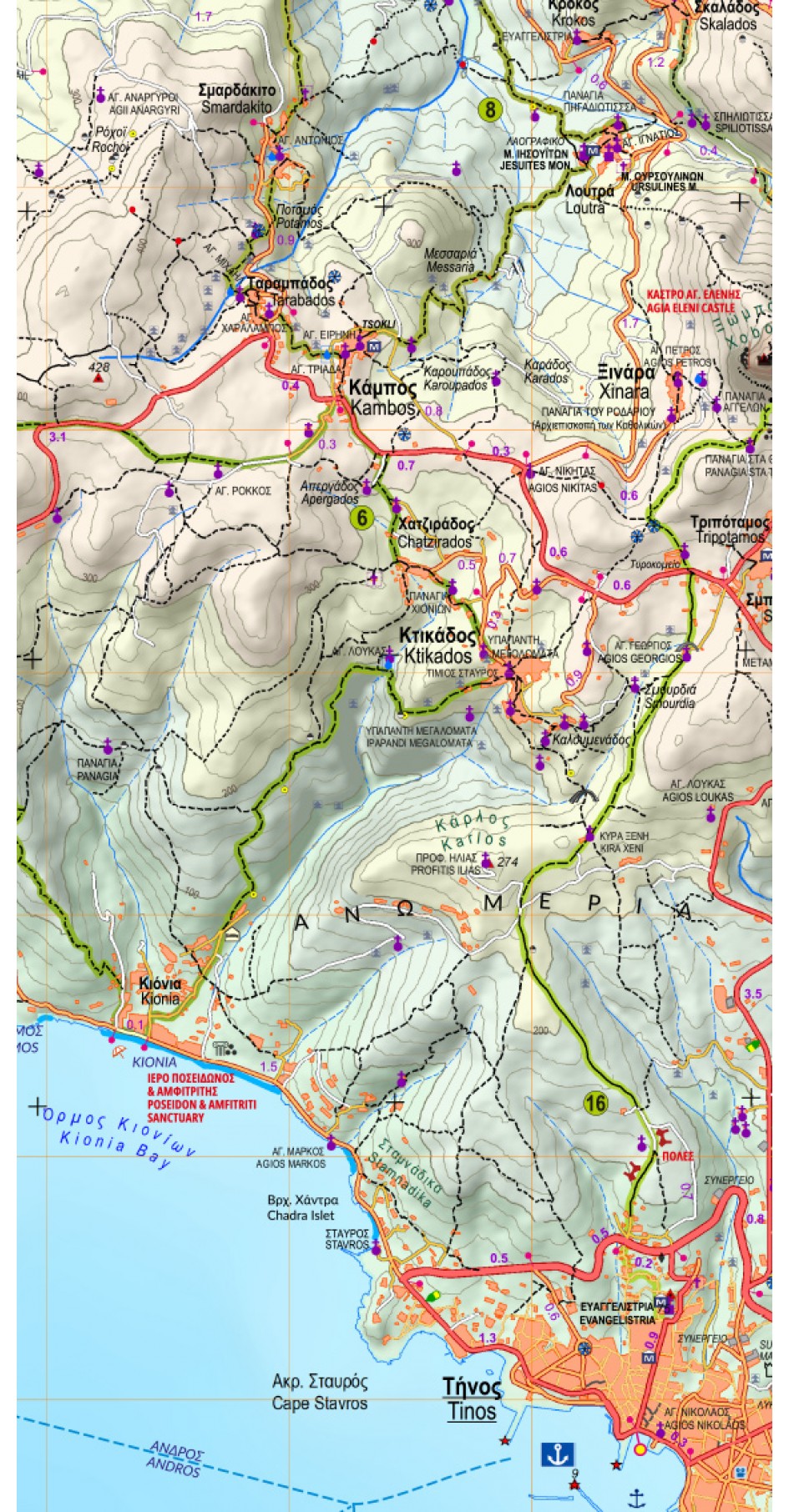 Tinos island landscape is like a hand made embroidery. Rural huts, dovecotes, churches, terraces and villages are woven into a net of trails. In the first edition of the map, along with my partner Charles Merlin we had recorded several dozens of kilometers of footpaths. From then until the present second edition, Charles made a bet and target to enrich the map in paths, - and put in the game and his friend George Kennedy. Actually the recorded paths, doubled, and plenty of churches, bridges, huts, dovecotes were added beside the paths. Along with the improvements in topographic background and color palette, the map of Tinos has reached very high standards - because we don't like the easy path. On the back side there are several proposed hiking trails with short descriptions and updated information for marking of the paths.