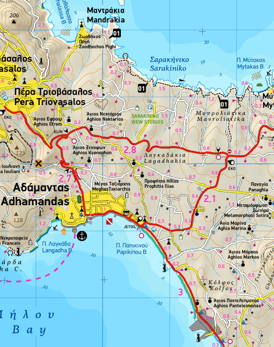 - The areas covered by mines on Milos and Kimolos are indicated, and climbing crags on Milos are shown for the first time. Also, recommended mountain-bike routes on Milos and Kimolos are shown. Moreover, the reverse side features an illustrated mini travel guide, with information on the island’s myths and history, geography and natural environment, sights and major attractions.