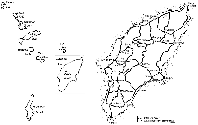 26 der 48 Streckenvorschläge beziehen sich auf Rhodos, die übrigen auf Patmos, Leros, Kalimnos, Kos, Nissiros, Tilos, Simi und Karpathos.