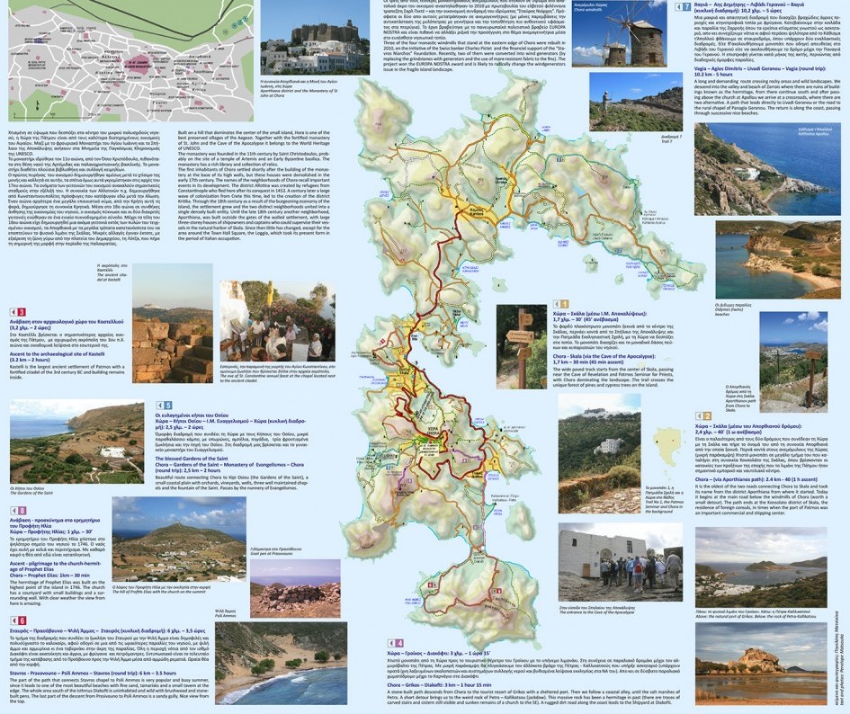 Op deze nieuwe kaart van Patmos staan de gemarkeerde wandelpaden aangegeven zodat u de rust en de esthetiek van het landschap kunt ervaren. Op de kaart zijn de topografieën, wegen, kerken, kapellen, stranden, paden en een netwerk van 8 bewegwijzerde wandelroutes die onlangs op het eiland zijn opgesteld, gedetailleerd afgebeeld.