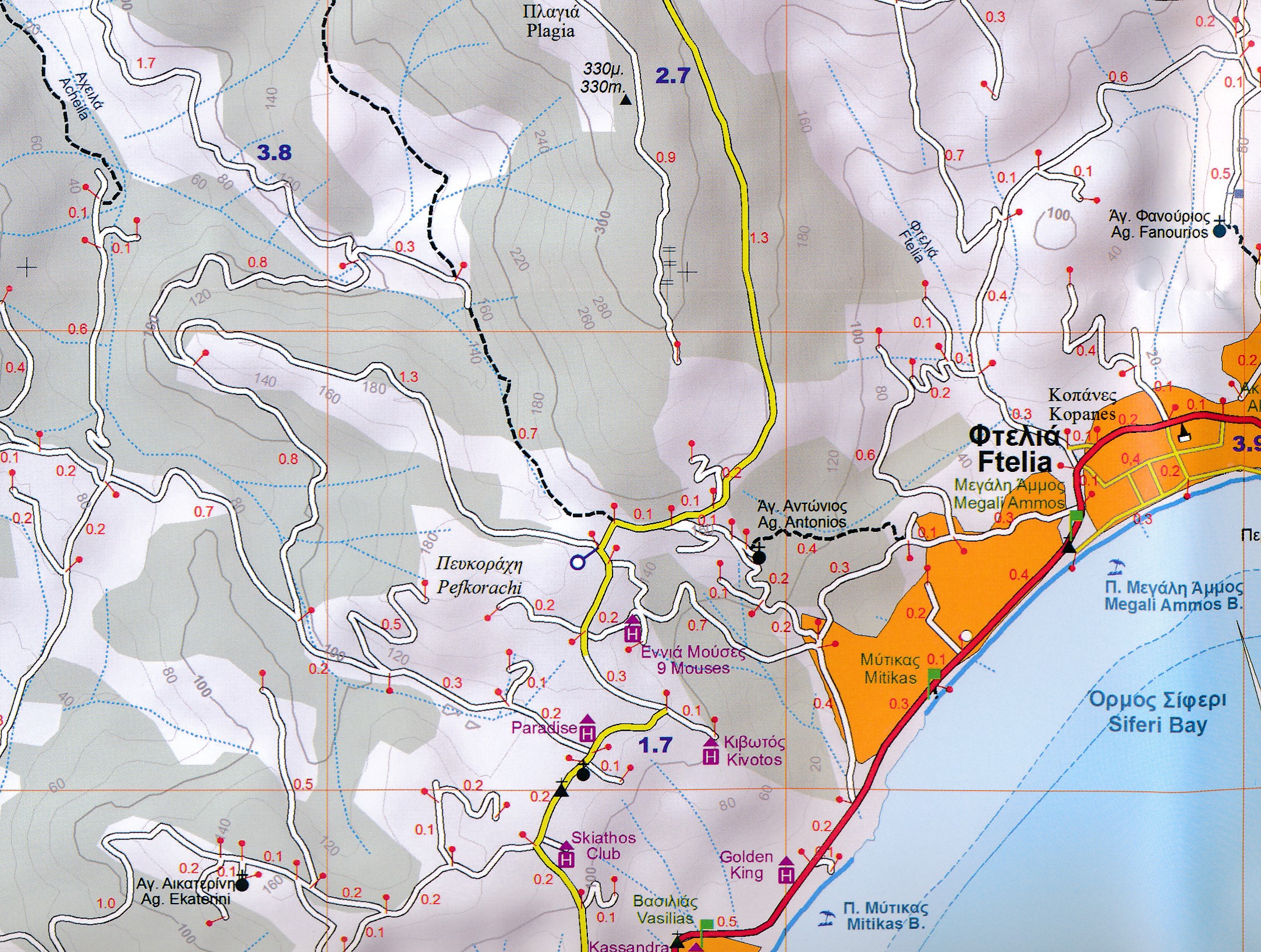 Deze toeristische kaart van Skiathos op een schaal van 1:25.000 bevat hoogtelijnen, geeft toeristische informatie waaronder de aanduiding van campings en stranden, is voor GPS-gebruik geschikt en is tweetalig ( Engels en Grieks).