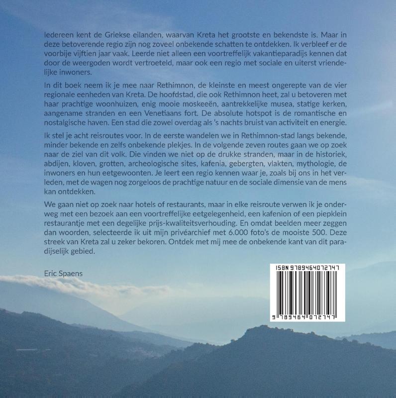 Ik stel je acht reisroutes voor. In de eerste wandelen we in Rethimnon-stad langs bekende, minder bekende en zelfs onbekende plekjes. In de volgende zeven routes gaan we op zoek naar de ziel van dit volk. Die vinden we niet op de drukke stranden, maar in de historiek, abdijen, kloven, grotten, archeologische sites, kafenia, gebergten, vlakten, mythologie, de inwoners en hun eetgewoonten. Je leert een regio kennen waar je, zoals bij ons in het verleden, met de wagen nog zorgeloos de prachtige natuur en de sociale dimensie van de mens kan ontdekken.