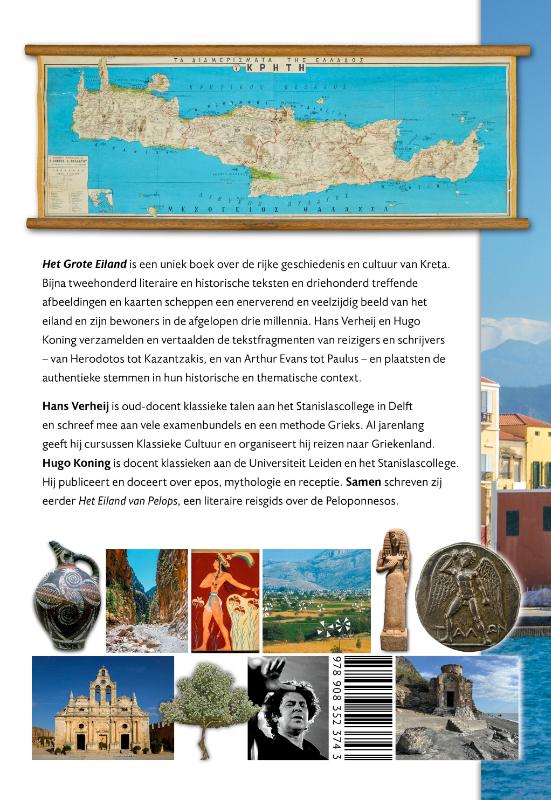 Het Grote Eiland is een uniek boek over de rijke geschiedenis en cultuur van Kreta. Bijna tweehonderd literaire en historische teksten en driehonderd treffende afbeeldingen en kaarten scheppen een enerverend en veelzijdig beeld van het eiland en zijn bewoners in de afgelopen drie millennia. Hans Verheij en Hugo Koning verzamelden en vertaalden de tekstfragmenten van reizigers en schrijvers – van Herodotos tot Kazantzakis, en van Arthur Evans tot Paulus – en plaatsten de authentieke stemmen in hun historische en thematische context. Hans Verheij is oud-docent klassieke talen aan het Stanislascollege in Delft en schreef mee aan vele examenbundels en een methode Grieks. Al jarenlang geeft hij cursussen Klassieke Cultuur en organiseert hij reizen naar Griekenland. Hugo Koning is docent klassieken aan de Universiteit Leiden en het Stanislascollege. Hij publiceert en doceert over epos, mythologie en receptie. Samen schreven zij eerder Het Eiland van Pelops, een literaire reisgids over de Peloponnesos.Reviews