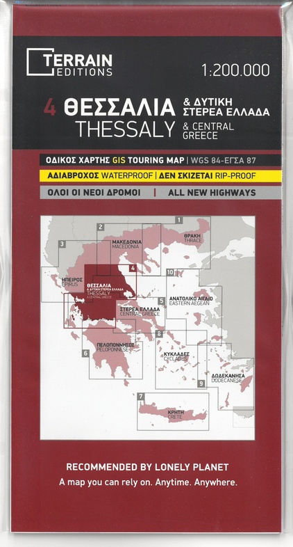 Landkaart van een deel van Griekenland met zeer veel plaatsen, kleine wegen, hoogtelijnen en toeristische informatie in symbolen aangegeven, met plaatsnamenregister - schaal 1:200.000. De kaart wordt veel gebruikt door fietsers vanwege de mate van detail, is watervast en GPS-geschikt.
