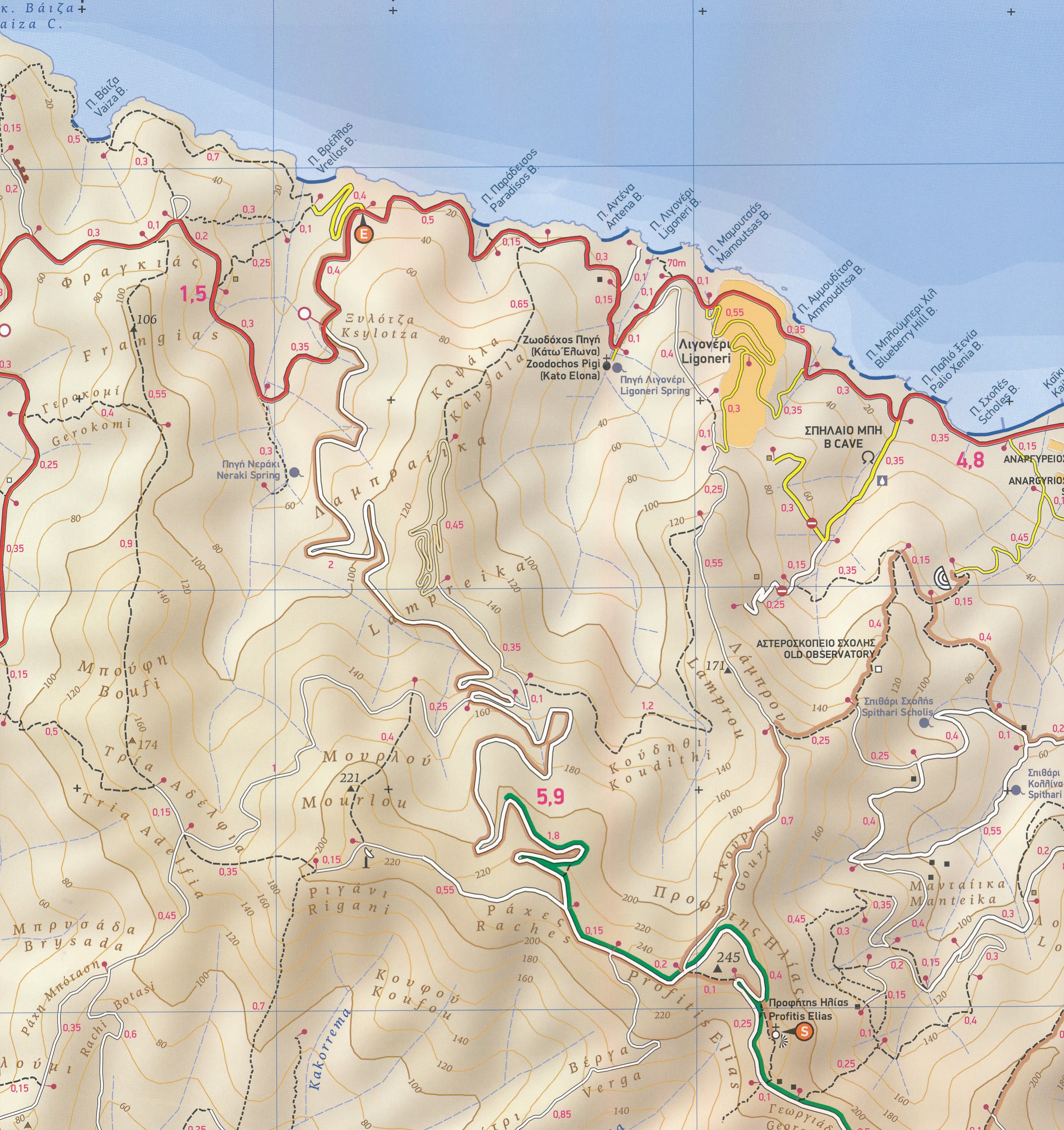 Gedetailleerde wegenkaart en wandelkaart met alle kleine wegen, wandelpaden, hoogtelijnen en toeristische informatie aangegeven. Alle tekst is tweetalig in Engels en Grieks en de waterproof kaart is geschikt voor gebruik met GPS.