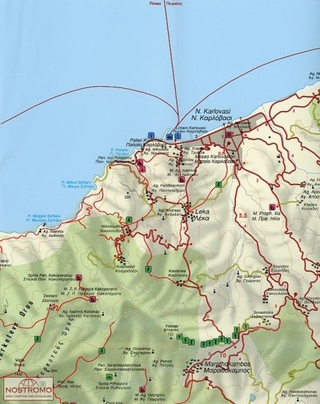 Goede wegenkaart van Samos, waarbij ook de kleinere wegen nog goed te lezen zijn. Gedetailleerde schaal van 1:50.000. Veel toeristische symbolen voor bezienswaardigheden als grotten, tempels, opgravingen maar ook mooie stranden etc.
