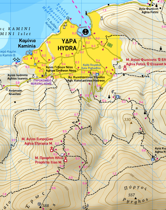 • It shows all the trails of the island, measured in kilometers so that you can estimate the duration of your hike. On the back side of the map you ‘ll find detailed descriptions of 4 of the best hikes in Hydra. These are distinctly labeled on the map, so you can easily locate them.