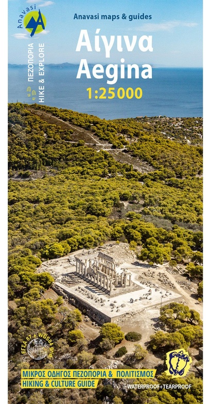 Egina eiland ligt heel dicht bij Athene, maar het heeft veel verborgen en wilde kanten. De Anavasi Aigina kaart is de beste manier om deze te ontdekken. De stranden van Egina variëren van zandstranden tot wilde rotsachtige kusten. Maar naast de charmante landschappen en stranden is het een plek die rijk is aan geschiedenis. Deze kaart nodigt u uit om Aigina te ontdekken en rond te lopen in het prachtige landschap. Aan de achterkant van de kaart vindt u voorgestelde wandelroutes en korte beschrijvingen van de belangrijkste bezienswaardigheden.