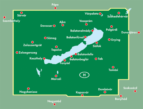 Uitstekende autokaart van het Balatonmeer met veel informatie als campings, natuurgebieden, hoofd- en kleine wegen en veel bezienswaardigheden.