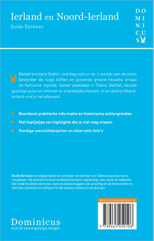 Deze reisgids staat boordevol praktische informatie, historische achtergronden, handige overzichtskaarten, sfeervolle foto's en uitgebreide culturele achtergrondinformatie, is altijd up-to-date en geschreven door een Nederlandstalige expert. Guido Derksen is reisjournalist en schrijver en schreef voor Dominicus meerdere reisgidsen. Hij bezoekt Ierland en Noord-Ierland regelmatig, voor werk en vakantie. Dat is altijd een feest, want de landschappen zijn prachtig en de Ieren behoren met hun openheid en zelfspot tot de leukste volkeren van Europa.