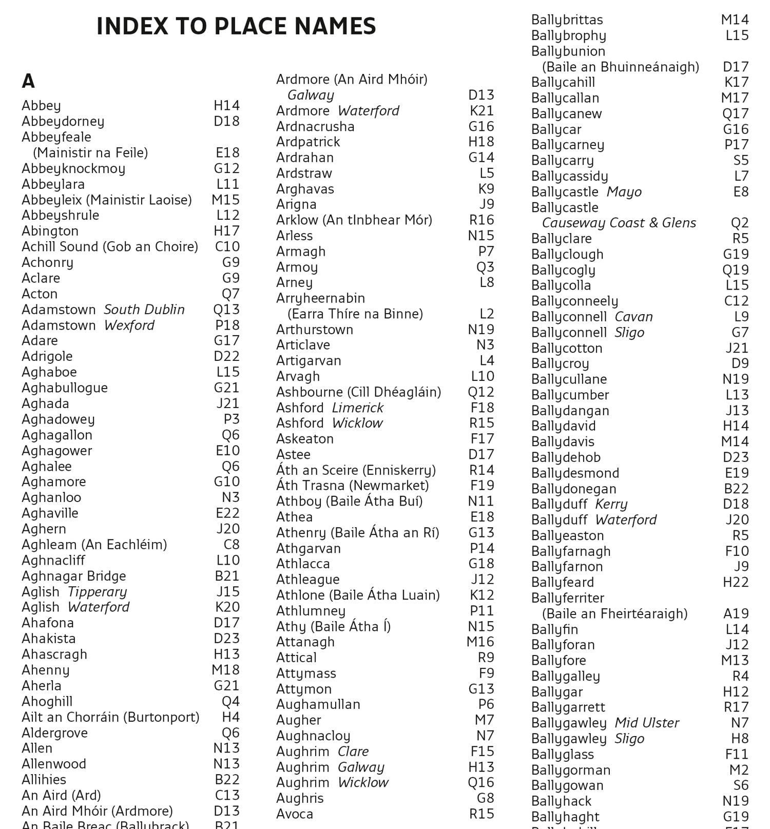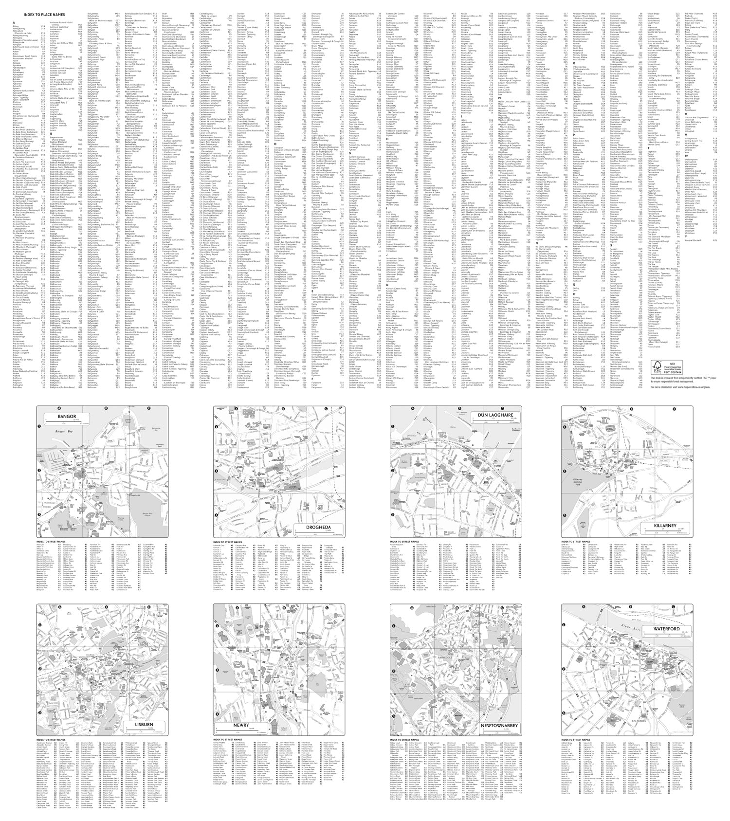 This map of Ireland shows the road network in detail. It is ideal for business users, with colouring of local council areas, but it is also perfect for tourists as a route planning map. Main features: Fully updatedNew administrative areas shown in colourClear, detailed road networkTown and city names, rivers, lakes, spot heights, railway lines and canals are clearly shownCity/town centre street plans of Belfast, Cork, Dublin, Dun Laoghaire, Galway, Limerick Londonderry/Derry and Waterford showing places of interestFull index to place namesMileage chartCar ferry routesKey in English, French and German Area of coverageCovers the whole of the Republic of Ireland and Northern Ireland