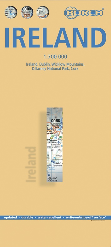 Dit is echt een kaart waar je het overzicht kunt vinden voor je reis. Heel Ierland staat op de ene kant en op de andere kant staan 4 gebieden uitvergroot. De kaart is glimmend gecoat en daardoor zeer waterafstotend. Deze kaart is ideaal voor het plannen van je auto reis en voor onderweg.