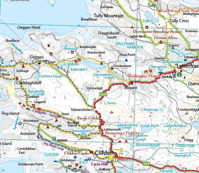 Cycling Routes Cycling Loops and trails located near ‘Cycle Hub’ towns such as Clifden and Doolin are shown: The Cleggan Cycle Loop The Roundstone Bog Road Loop The Errislannan Cycle Loop The Sheeffry Cycle Route The Derroura Mountain Bike Trail The Portumna Forest Mountain Bike Trail The Burren Cycleway The Slieve Elva Loop The Dolmen Cycleway The Lough Derg Cycleway (partly shown) Although Galway does not have any signposted long distance cycle routes, all the scenic drives are shown which allows the cyclist to choose from a number of options when planning a suitable route