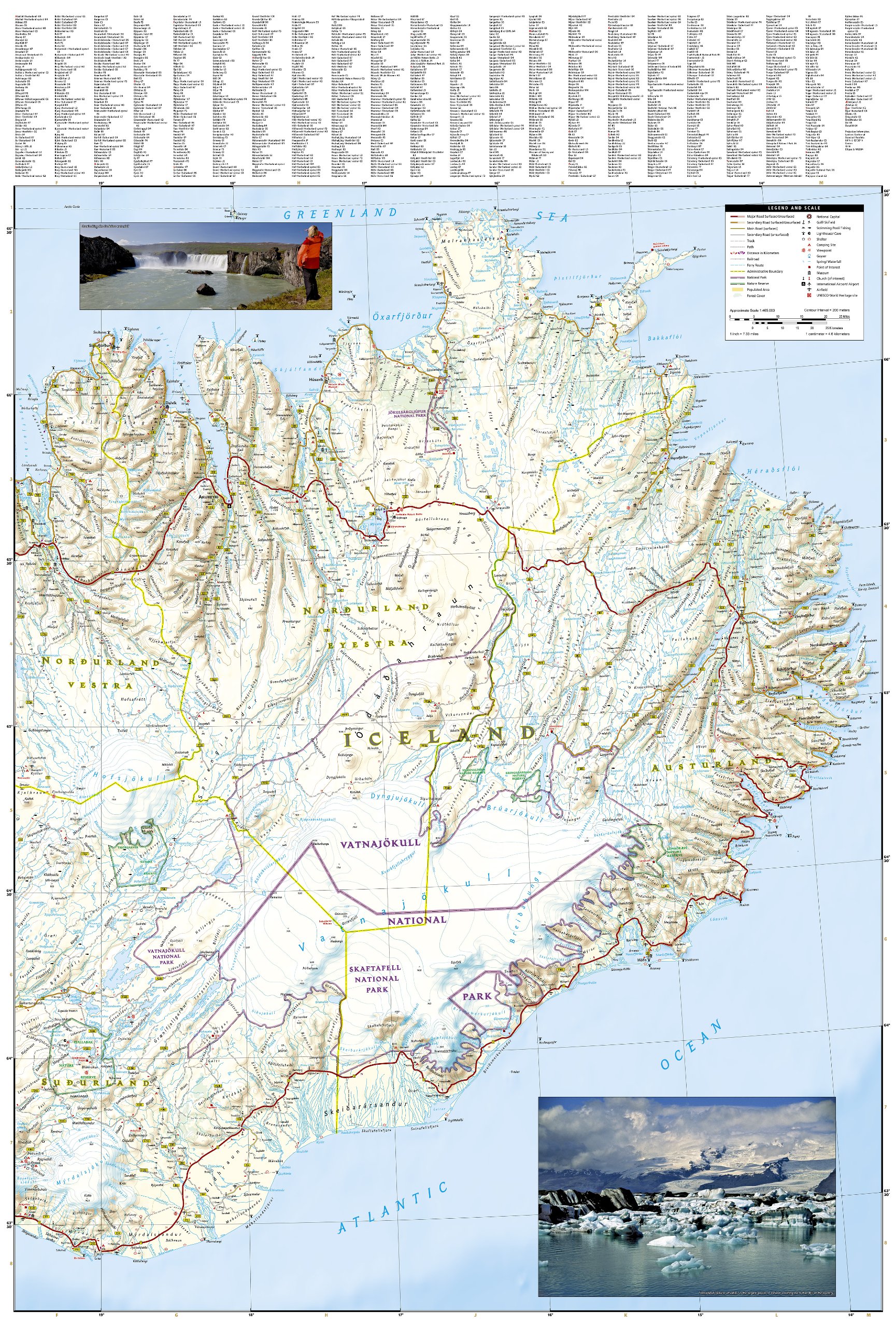 Wegenkaart van IJsland met vermelding van veel bezienswaardigheden, nationale parken en attrakties. Watervast en scheurvast. Juist door deze vermeldingen onderscheidt de kaart zich van andere wegenkaarten.