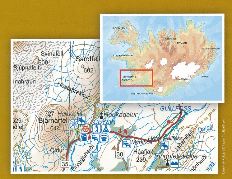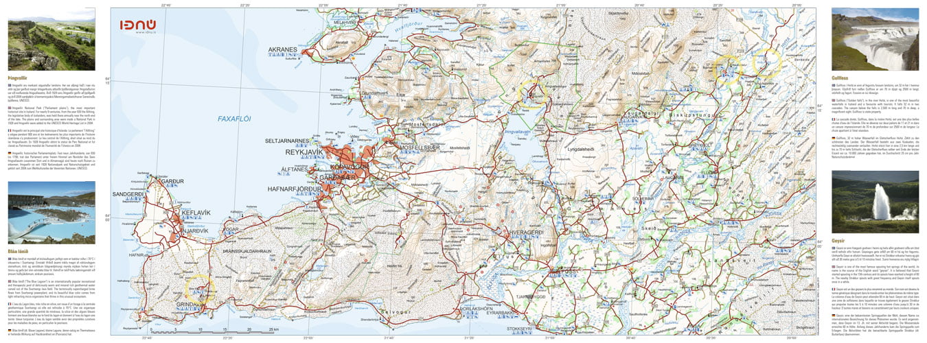 Quality map of the most popular tourist route in South Iceland, Gullfoss - Geysir - Þingvellir, with pictures and information of the highlights of the tour like the Blue lagoon. The map contains the latest information about Iceland's road system, including road distances and road numbers, as well as important travel-service information.
