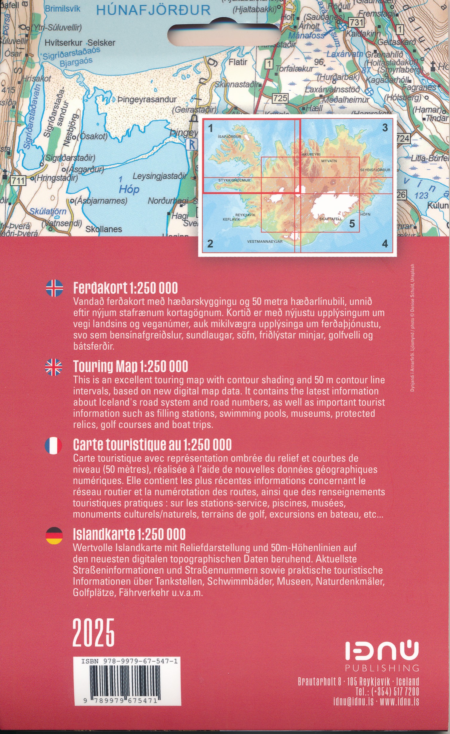 Wegenkaart Ijsland Noord-WestDit is een uitstekende toerkaart met contourschaduwen en 50 m contourlijnintervallen op basis van nieuwe digitale kaartgegevens. Het bevat de nieuwste informatie over het wegennet van IJsland, inclusief wegafstanden en wegnummers, evenals belangrijke toeristische informatie, zoals tankstations, accommodatie, zwembaden, musea, beschermde relikwieën, golfbanen, uitkijkwanden en boottochten.