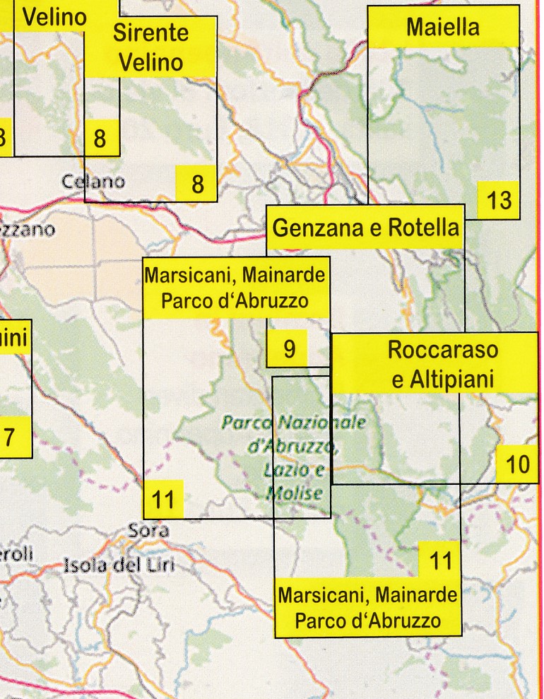 Topografische kaart schaal 1:25.000 van het nationale park Abruzze met wandelroutes ingetekend, gebied omvat Monti Marsicani, Monti della Meta, Valle del Giovenco, Mainarde. De kaartenset bestaat uit 2 losse deelkaarten.