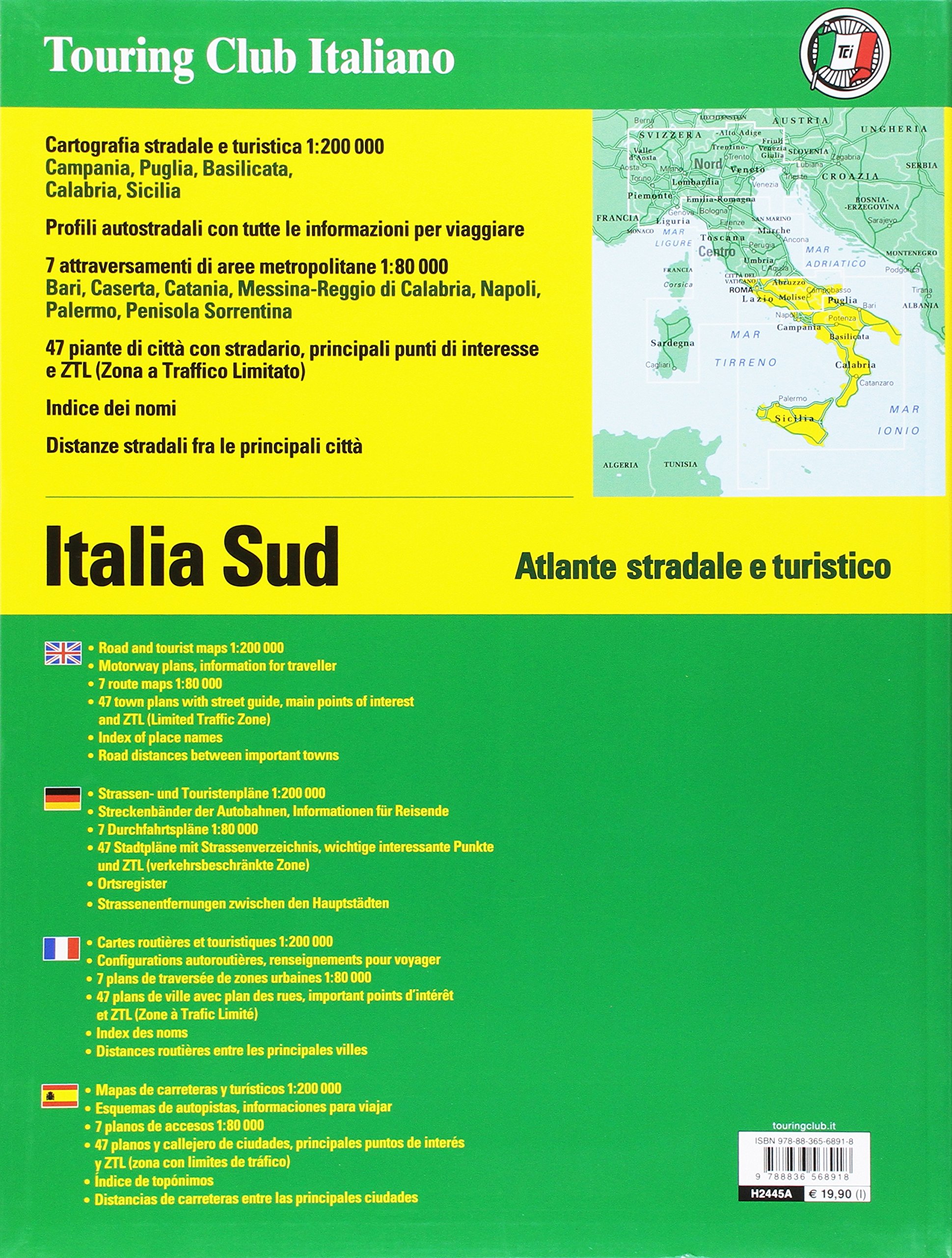 Atlas van de Italiaanse ANWB, goed kaartbeeld. Wel met omgevingskaarten van belangrijke steden en stadsplattegronden. Kaarten vanaf Rome naar het zuiden.