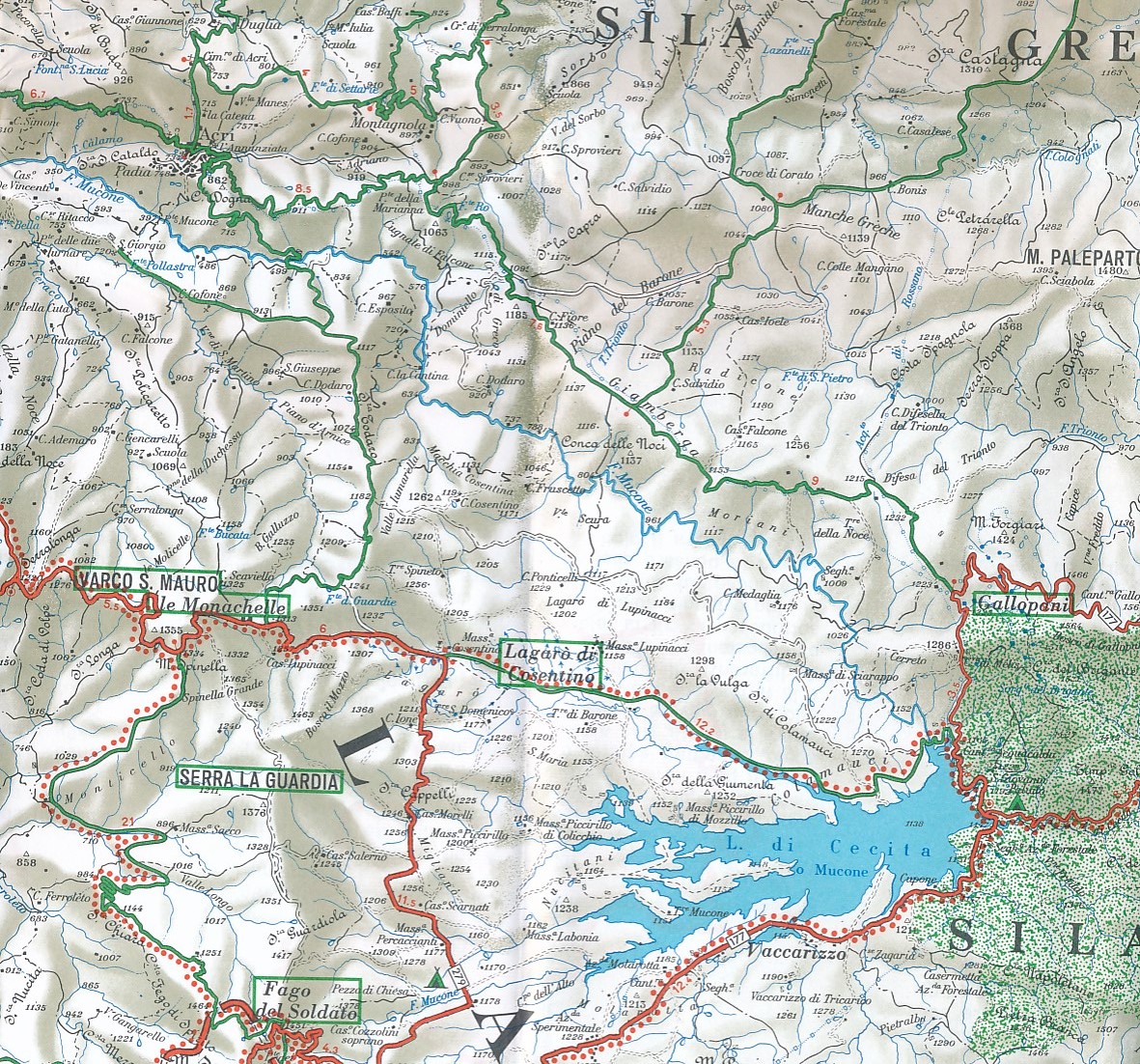 Mooi kleurgebruik en met symbolen worden campings en hutten weergegeven. Ingetekend zijn de doorgaande wandelpaden waardoor deze kaart voor trekkings redelijk geschikt is. De kaart dekt het gebied tussen Rossano, Catanzaro, Cosenza en Santa Severina.