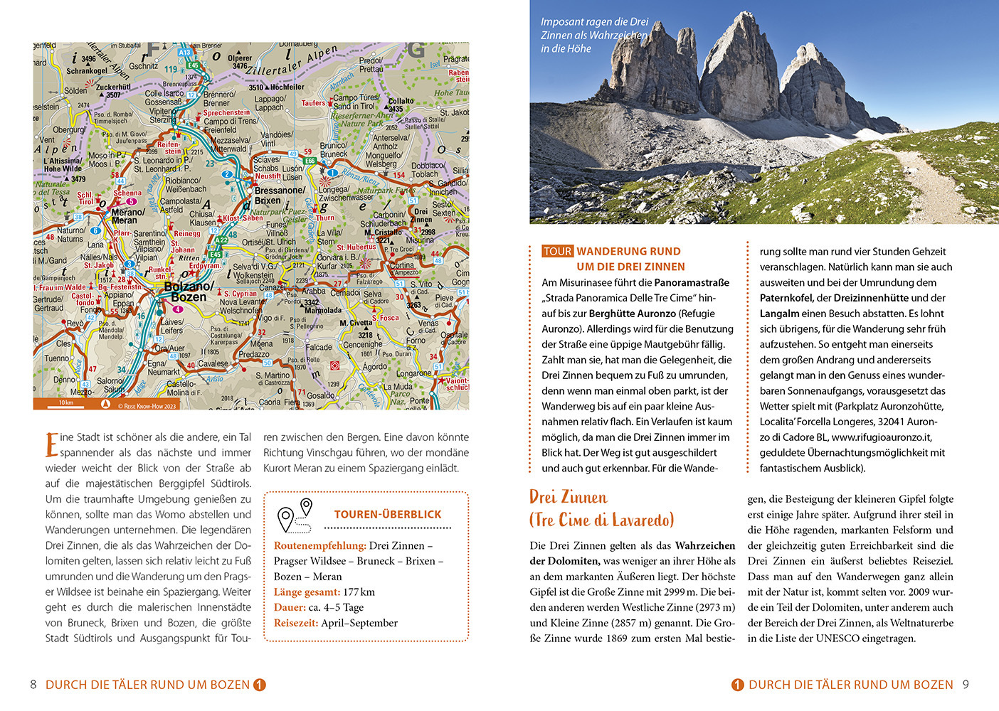 Durch die Täler rund um Bozen Rund um den Gardasee Venetien: Vom Alpenrand in die Po-Ebene Städtetour auf der Via Emilia Rund um den Comer See Inselhopping am Lago Maggiore Durch das Aostatal Riviera di Ponente/Westliche Riviera Riviera di Levante/Östliche Riviera Toskana: Pisa, Lucca, Vinci, Pistoia und Prato Toskana: Certaldo, San Gimignano, Volterra und die etruskische Küste Weinorte in der Toskana Umbrien: Die Mitte Italiens von Assisi bis Orvieto Apulien: Entlang der südlichen Adriaküste Basilikata: Welterbe Matera und Ionisches Meer Kalabrien: Bergregion und Badeparadies an der Stiefelspitze Sizilien: Ätnarundfahrt Sizilianische Barockstädte Sardiniens Ostküste: Von Olbia bis zur Costa Rei Sardiniens Westküste: Von Porto Torres bis zur Costa Verde