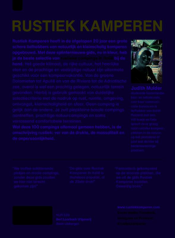 Rustiek Kamperen heeft in de afgelopen 20 jaar een grote schare liefhebbers van natuurlijk en kleinschalig kamperen opgebouwd. Met deze splinternieuwe gids, nu in kleur, heb je de beste selectie van rustieke campings in Italië bij de hand. Het goede klimaat, de rijke cultuur, het heerlijke eten en de prachtige en veelzijdige natuur zijn uitermate geschikt voor een kampeervakantie. Van de groene Dolomieten tot Apulië en van de Riviera tot de Adriatische zee, overal is wel een prachtig gelegen, natuurlijk terrein gevonden. Hierbij is gebruik gemaakt van duidelijke selectiecriteria met de nadruk op rust, ruimte, omgeving, ontvangst, kleinschaligheid en sfeer. Geen camping is gelijk aan de andere. Je zult piepkleine basale campings aantreffen, prachtige natuurcampings en soms verrassend comfortabele terreinen. Wat deze 100 campings allemaal gemeen hebben, is de omschrijving rustiek: ver van de drukte, de massaliteit en de onpersoonlijkheid.