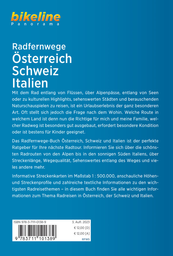 Mit dem Rad entlang von Flüssen, über Alpenpässe, entlang von Seen oder zu kulturellen Highlights, sehenswerten Städten und berauschenden Naturschauspielen zu reisen, ist ein Urlaubserlebnis der ganz besonderen Art. Oft stellt sich jedoch die Frage nach dem Wohin. Welche Route in welchem Land ist denn nun die Richtige für mich und meine Familie, welcher Radweg ist besonders gut ausgebaut, erfordert besondere Kondition oder ist bestens für Kinder geeignet. Das RadFernWege-Buch Österreich, Schweiz und Italien ist der perfekte Ratgeber für Ihre nächste Radtour. Informieren Sie sich über die schönsten Radrouten von den Alpen bis in den sonnigen Süden Italiens, über Streckenlänge, Wegequalität, Sehenswertes entlang des Weges und vieles andere mehr. Informative Streckenkarten im Maßstab 1 : 500.000, anschauliche Höhenund Streckenprofile und zahlreiche textliche Informationen zu den wichtigsten Radreisethemen – in diesem Buch finden Sie alle wichtigen Informationen zum Thema Radreisen in Österreich, der Schweiz und Italien.