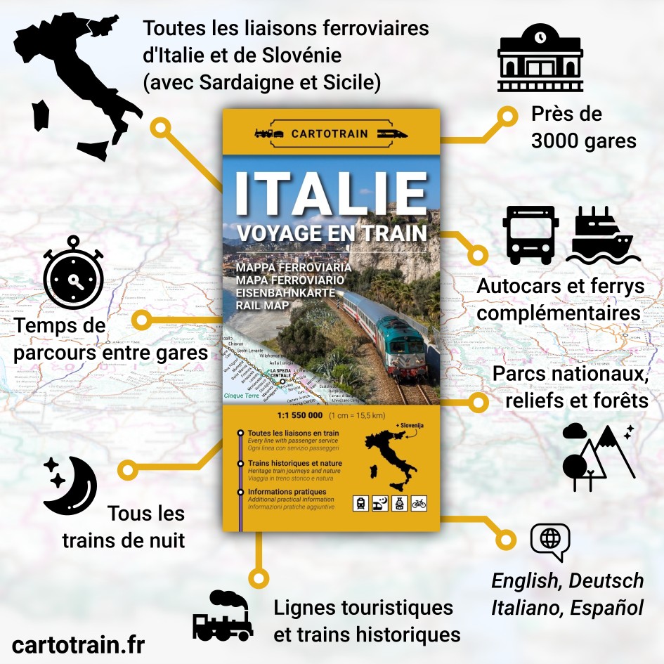 De bakermat van de Romeinse beschaving heeft ook een uitstekend spoorwegnet! Minder dan een jaar na het succes van de kaart van Frankrijk is CARTOTRAIN terug met de uitvouwbare papieren kaart voor treinreizen in Italië: