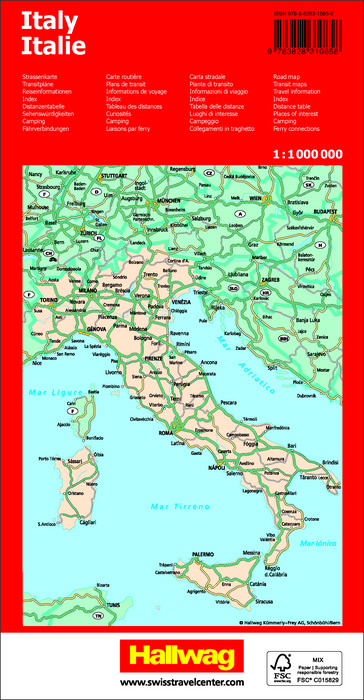 Goede overzichtelijke wegenkaart van Italië met register en afstandentabel.The Hallwag road map is a good clear map which includes places of interest marked on the map. The map also includes a distoguide which is an integrated mileage chart on the outer map cover. This allows you to read off more than 2000 distances by using the sliding mileage chart.