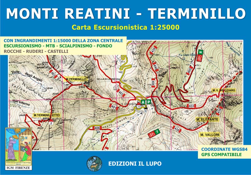 Map of the Terminillo climbs 1:25000 on basic IGM Paths CAI, paths in MTB, alpine ski and ski country Map forehead-back, the back contains two enlargements 1:15000 (summer and winter) of the central zone. The map also brings the indications of the castles of the fortresses and of the most important ruins in the zone. The coordinates are UTM and map-datum WGS84