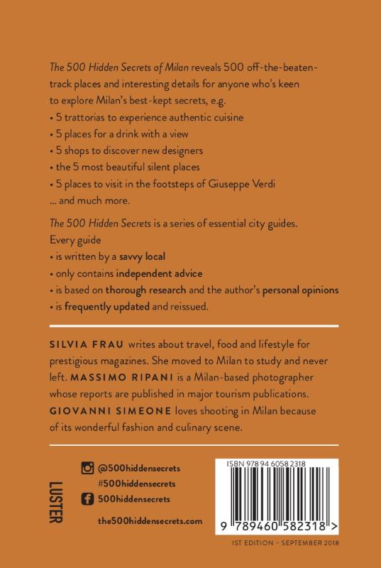 A new title in the successful series The 500 Hidden Secrets, The 500 Hidden Secrets of Milan gives you 500 reasons to book a city trip to Milan. True local and journalist Silvia Frau shares in this affectionate guide 500 favourite places in her hometown in fun lists of five, such as 5 trattorias for truly authentic Italian cuisine, the 5 best bars for an aperitivo, 5 old-school stationery shops, the 5 most beautiful silent spots, 5 addresses to visit in the footsteps of Giuseppe Verdi and much more.
