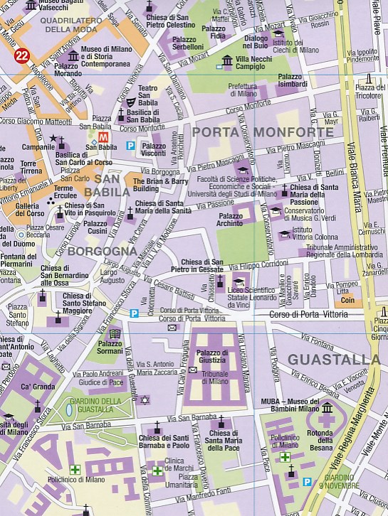 Geplastificeerde kaart van Milaan, met register. Voor de 'gewone' toerist een handige kaart, geen groot formaat, overzichtelijk met alle belangrijke plaatsen goed weergegeven.
