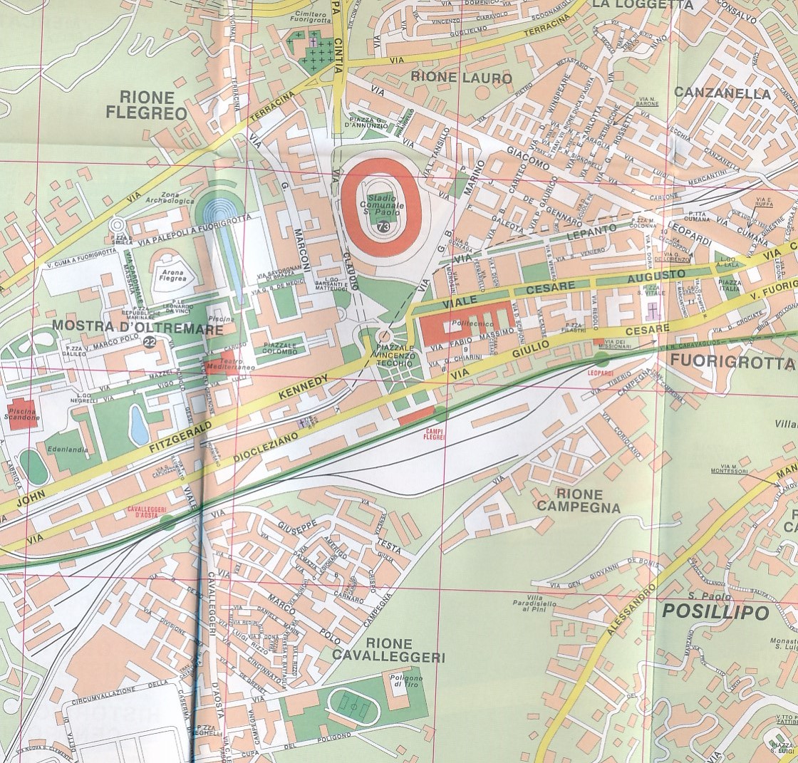 Stadsplattegrond van Napoli - Napels op een schaal van 1:12.000 met een extra uitvergroting van het centrum van de stad op een schaal van 1:8.000: bijzonder gedetailleerd ! De kaart is door het heldere kleurgebruik zeer leesbaar en op de kaart staan de belangrijkste monumenten genummerd aangegeven. Op de achterzijde van de kaart staat een uitgebreid register.