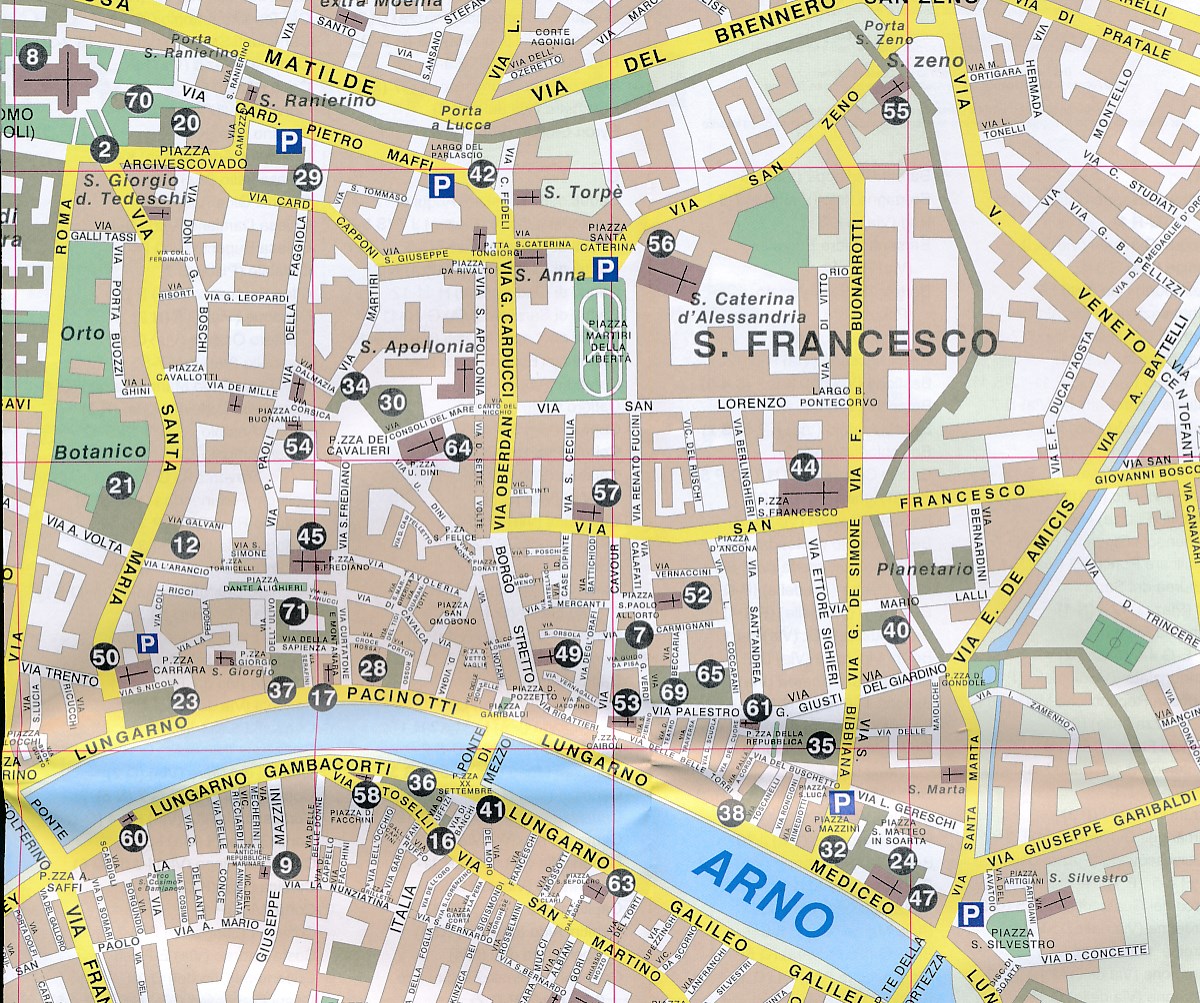 Stadsplattegrond van Pisa op een schaal van 1:10.000 met een extra uitvergroting van het centrum van de stad op een schaal van 1:7.000: bijzonder gedetailleerd ! De kaart is door het heldere kleurgebruik zeer leesbaar en op de kaart staan de belangrijkste monumenten genummerd aangegeven. Op de achterzijde van de kaart staat een uitgebreid register.