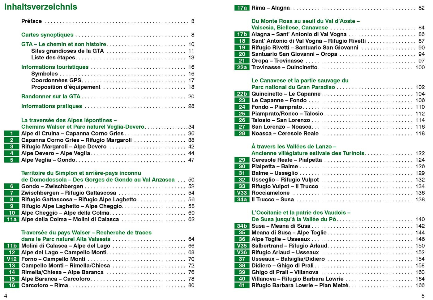 Avec un parcours d’environ 900 kilomètres et un dénivelé de 65.000 mètres, la GTA, divisée en 65 étapes, représente un vrai défi pour les randonneurs au long cours, rares sont ceux qui peuvent l’effectuer en une seule fois. C’est pourquoi le guide Rother la divise en sections d’une semaine avec des points d’arrivée et de départ facilement accessibles par les moyens de transport.