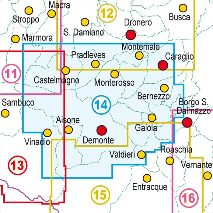 Gebied: Aisone, Bermezzo, Caraglio, Castelmagno, Cervasca, Demonte, Gaiola, Moiola, Montemale, Monterosso, Pradleves, Rittana, Roccasparvera, Valdieri, Valgrana, Valloriate, Vignolo