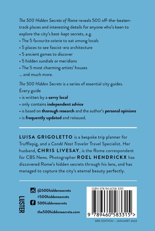 New & fully updated edition 2023 The 500 Hidden Secrets of Rome reveals 500 off-the-beaten track places and interesting details for anyone who’s keen to explore the city’s best-kept secrets, such as • The 5 favourite osterie to eat among locals • 5 places to see fascist-era architecture • 5 ancient games to discover • 5 hidden sundials or meridians • The 5 most charming artists’ houses … and much more. The 500 Hidden Secrets is a series of essential city guides. Every guide, is written by a savvy local, only contains independent advice, is based on thorough research and the author’s personal opinions, is frequently updated and reissued. LUISA GRIGOLETTO is a bespoke trip planner for Trufflepig, and a Condé Nast Traveler Travel Specialist. Her husband, CHRIS LIVESAY, is the Rome correspondent for CBS News. Photographer ROEL HENDRICKX has discovered Rome’s hidden secrets through his lens, and has managed to capture the city’s eternal beauty perfectly.