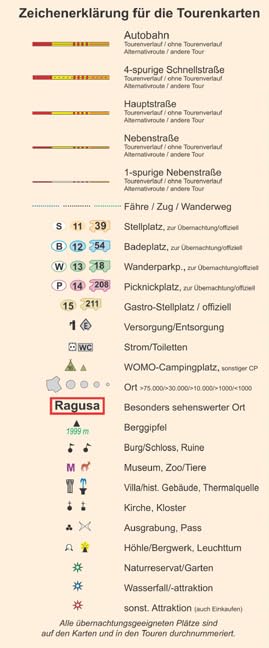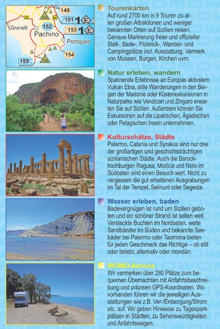 TourenkartenAuf rund 2700 km in 9 Touren zu allen großen Attraktionen und weniger bekannten Orten auf Sizilien reisen. Genaue Markierung freier und offizieller Stell-, Bade-, Picknick-, Wander- und Campingplätze incl. Ausstattumng. Vermerk von Museen, Burgen, Kirchen uvm. Natur erleben, wandernSpannende Erlebnisse an Europas aktivsten Vulkan Etna, stille Wanderungen in den Bergen der Madonie oder Küstenexkursionen in Naturparks wie Vendicari und Zingaro erwarten Sie auf Sizilien. Außerdem können Sie Exkursionen auf die Liparischen, Ägadischen oder Pelagischen Inseln unternehmen. Kulturschätze, StädtePalermo, Catania und Syrakus sind dur drei der großartigen und geschichtsträchtigen sizilianischen Städte. Auch die Barockhochburgen Ragusa, Modica und Noto im Südosten sind einen Besuch wert. Nicht zu vergessen die gut erhaltenen Ausgrabungen im Tal der Tempel, Selinunt oder Segesta. Wasser erleben, badenBadevergnügen ist rund um Sizilien geboten und ein schöner Strand ist selten weit. Versteckte Buchten im Nordosten, weite Sandbänder im Süden und bekannte Seebäder bei Palermo oder Taomina bieten für jeden Geschmack das Richtige - ob still oder belebt, alternativ oder mondän. WOMO-ServiceWir vermerken über 280 Plätze zum bequemen Übernachten mit Anfahrtsbeschreibung und präzisen GPS-Koordinaten. Wo vorhanden führen wir die jeweiligen Ausstattungen wie z.B. Ver-/Entsorgung/Strom etc. auf. Wir geben Hinweise zu Tagesparkplätzen in Städten, zu Sehenswürdigkeiten und Anfahrtswegen.