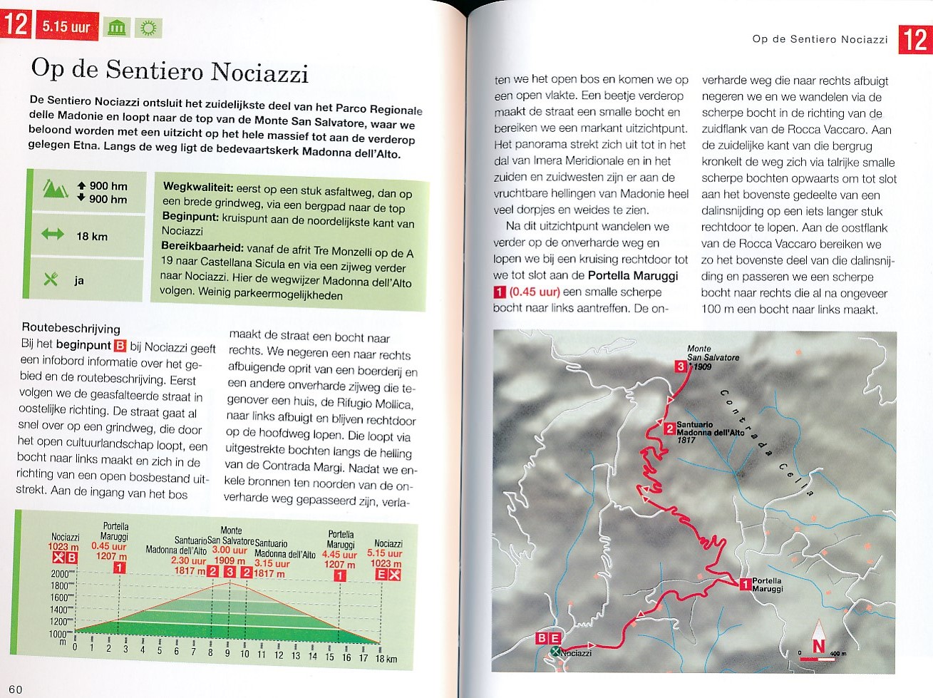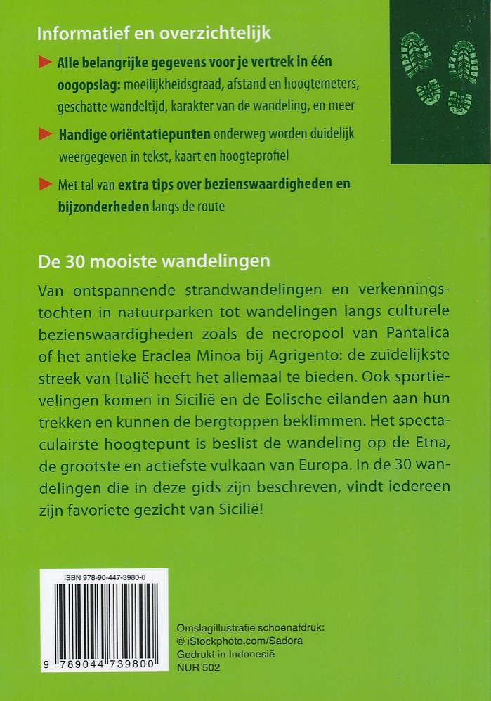 Van ontspannende strandwandelingen en verkenningstochten in natuurparken tot wandelingen langs culturele bezienswaardigheden zoals de necropool van Pantalica of het antieke Eraclea Minoa bij Agrigento: de zuidelijkste streek van Italië heeft het allemaal te bieden. Ook sportievelingen komen in Sicilië en de Eolische eilanden aan hun trekken en kunnen de bergtoppen beklimmen. Meer dan 80% van het eiland bestaat namelijk uit berg- en heuvelland. Het spectaculairste hoogtepunt is beslist de wandeling op de Etna, de grootste en actiefste vulkaan van Europa. In de 30 wandelingen die in deze gids zijn beschreven, vindt iedereen zijn favoriete gezicht van Sicilië!