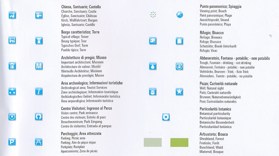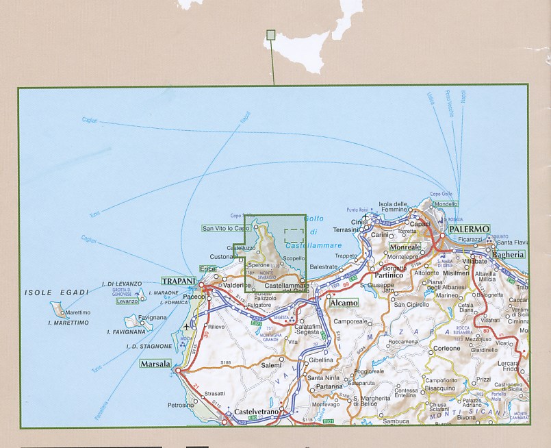 Bijzonder gedetailleerde wandelkaart van een natuurreservaat aan de noordwestkust van Sicilië. Met hoogtelijnen en ingetekende wandelpaden en daarnaast een aantal symbolen voor bezienswaardigheden en stranden in dat gebied.
