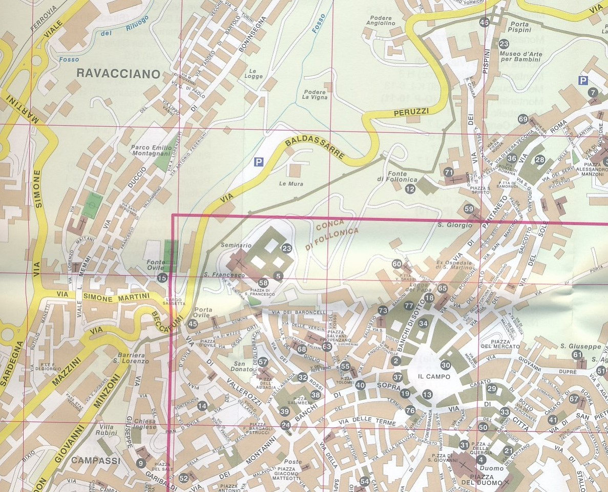 Stadsplattegrond van Siena op een schaal van 1:7.000 met een extra uitvergroting van het centrum van de stad op een schaal van 1:4.500: bijzonder gedetailleerd ! De kaart is door het heldere kleurgebruik zeer leesbaar en op de kaart staan de belangrijkste monumenten genummerd aangegeven. Op de achterzijde van de kaart staat een uitgebreid register.