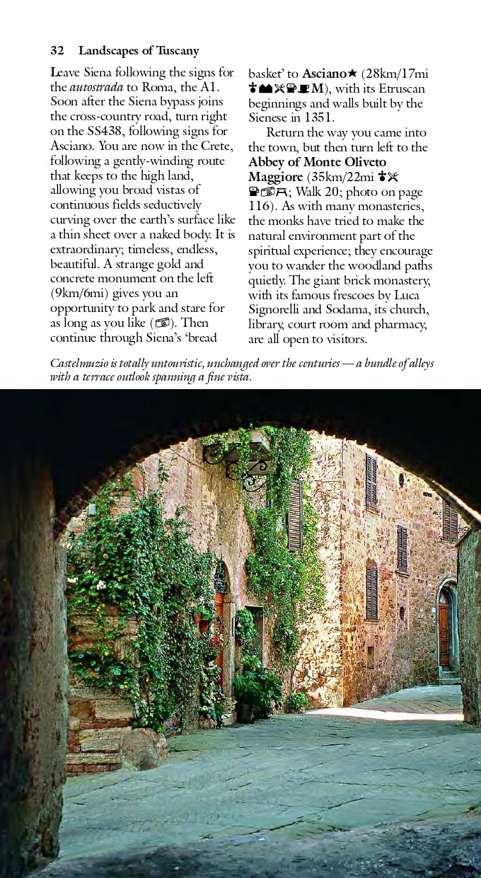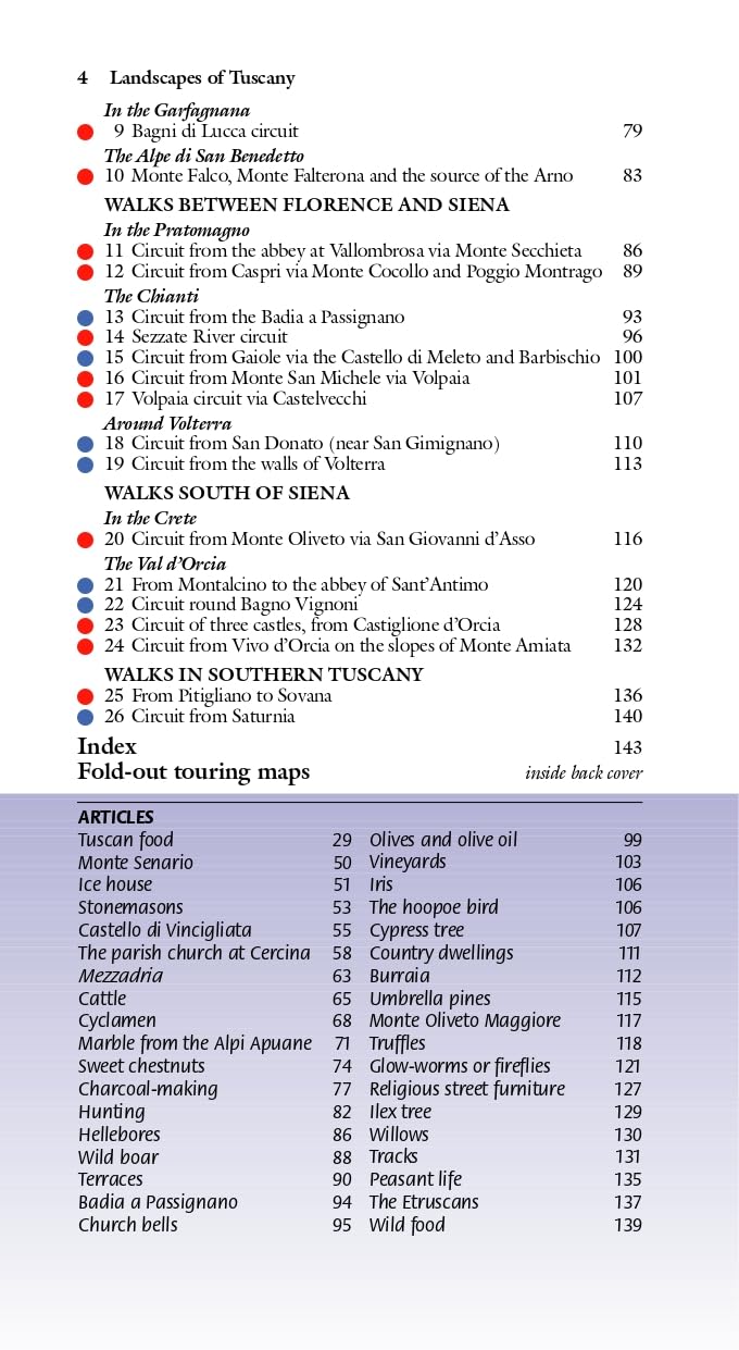 This guide book is designed for visitors walking in Tuscany and touring Tuscany by car. While the region’s historic towns and architectural highlights are often the focal points for these excursions, the role of the Tuscan peasant in creating this glorious landscape is stressed throughout — especially in the wealth of background information about Tuscany’s customs and cuisine, flora, fauna and history — all of them illustrated.The book should be particularly suitable for those who wish to combine a visit to Florence with seeing the Italian countryside (you’ll need a good city guide for Florence, while this ‘Landscapes’ guide will show you the best of the rural scene.)