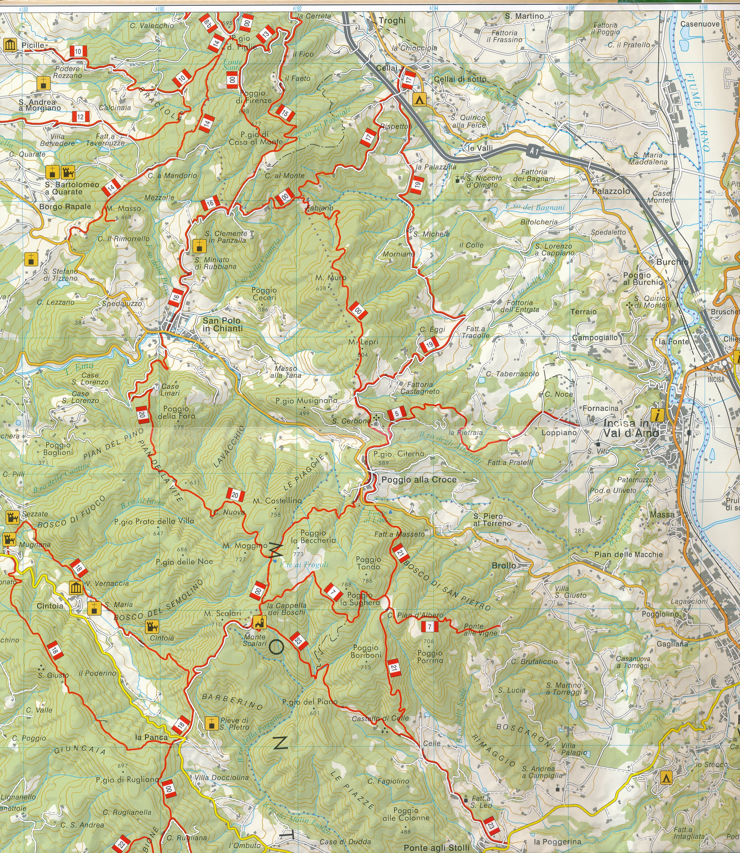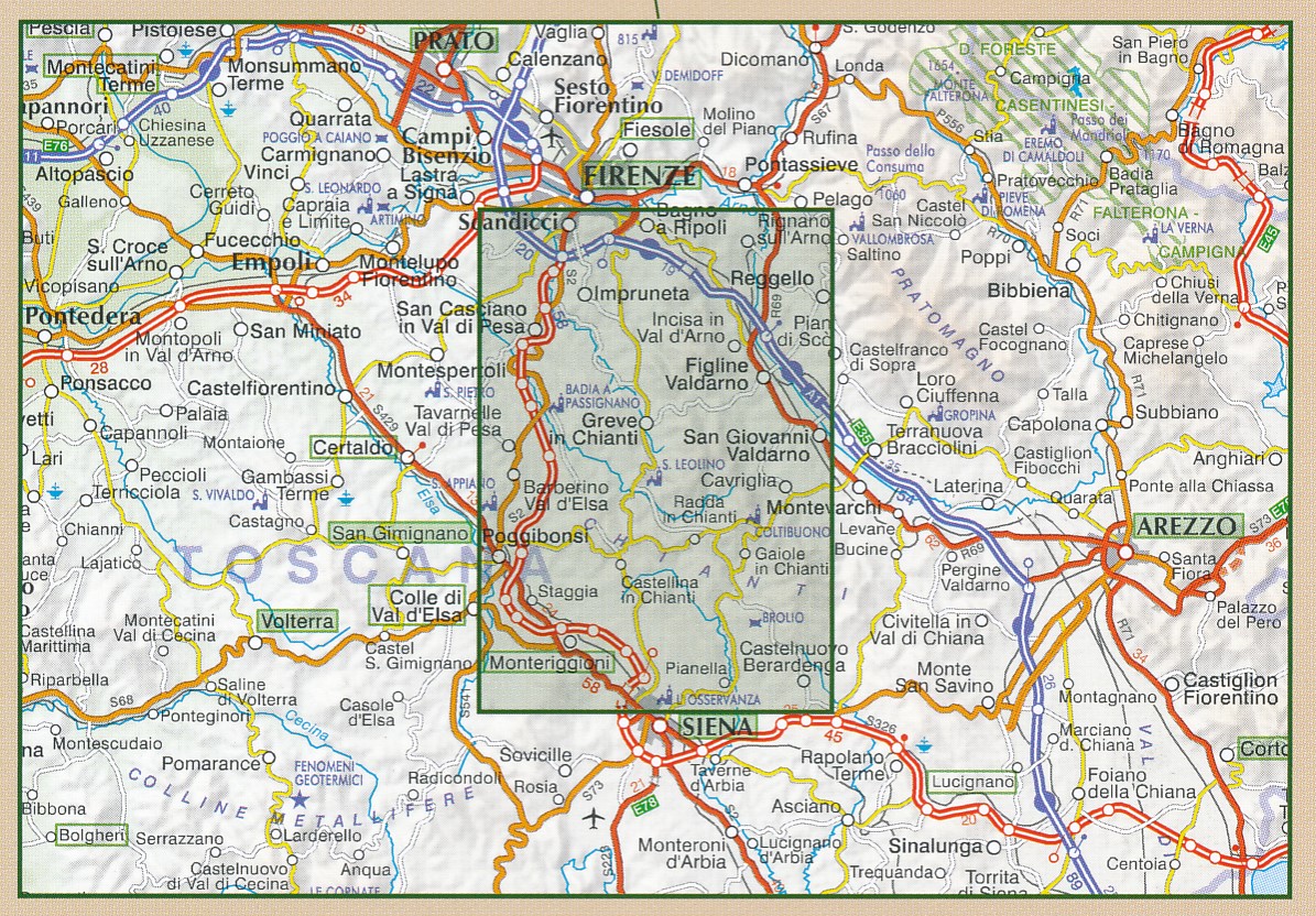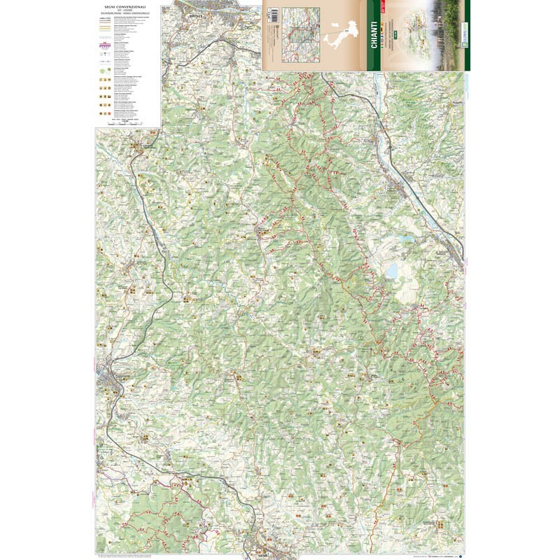 Folded topographic hiking map of the Chianti area of Italy. The map has 25 m contours, shows hiking trails, etc. Coverage extends from Tavarnelle Val di Pesa and Poggibonsi in the east to San Giovanni Valdarno and Castelnuovo Berardegna in the west.