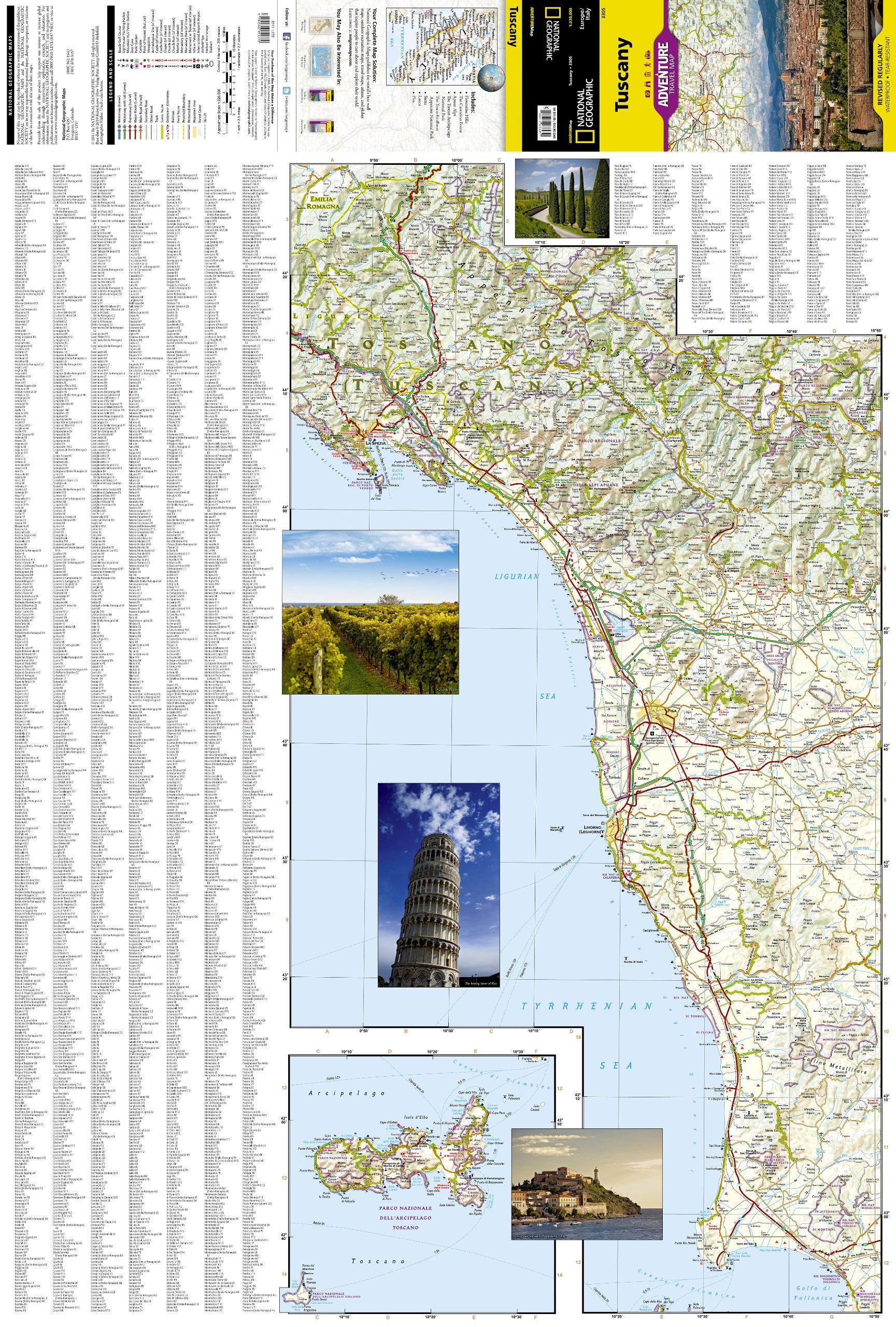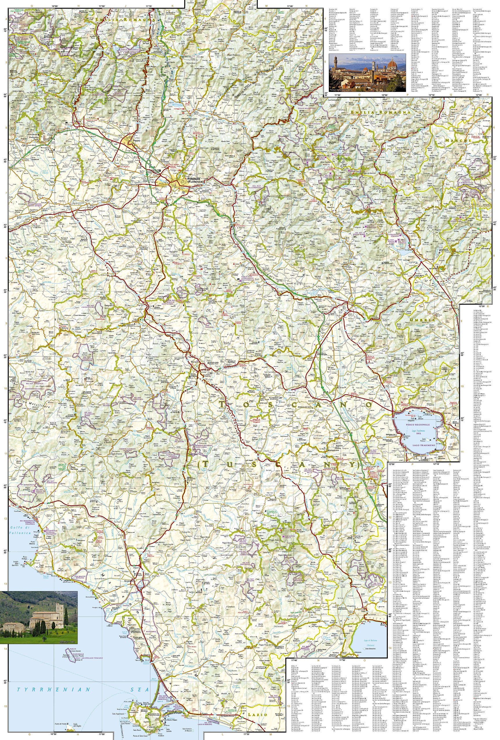 Wegenkaart van Toscane met vermelding van veel bezienswaardigheden, nationale parken en attrakties. Watervast en scheurvast. Juist door deze vermeldingen onderscheidt de kaart zich van andere wegenkaarten.