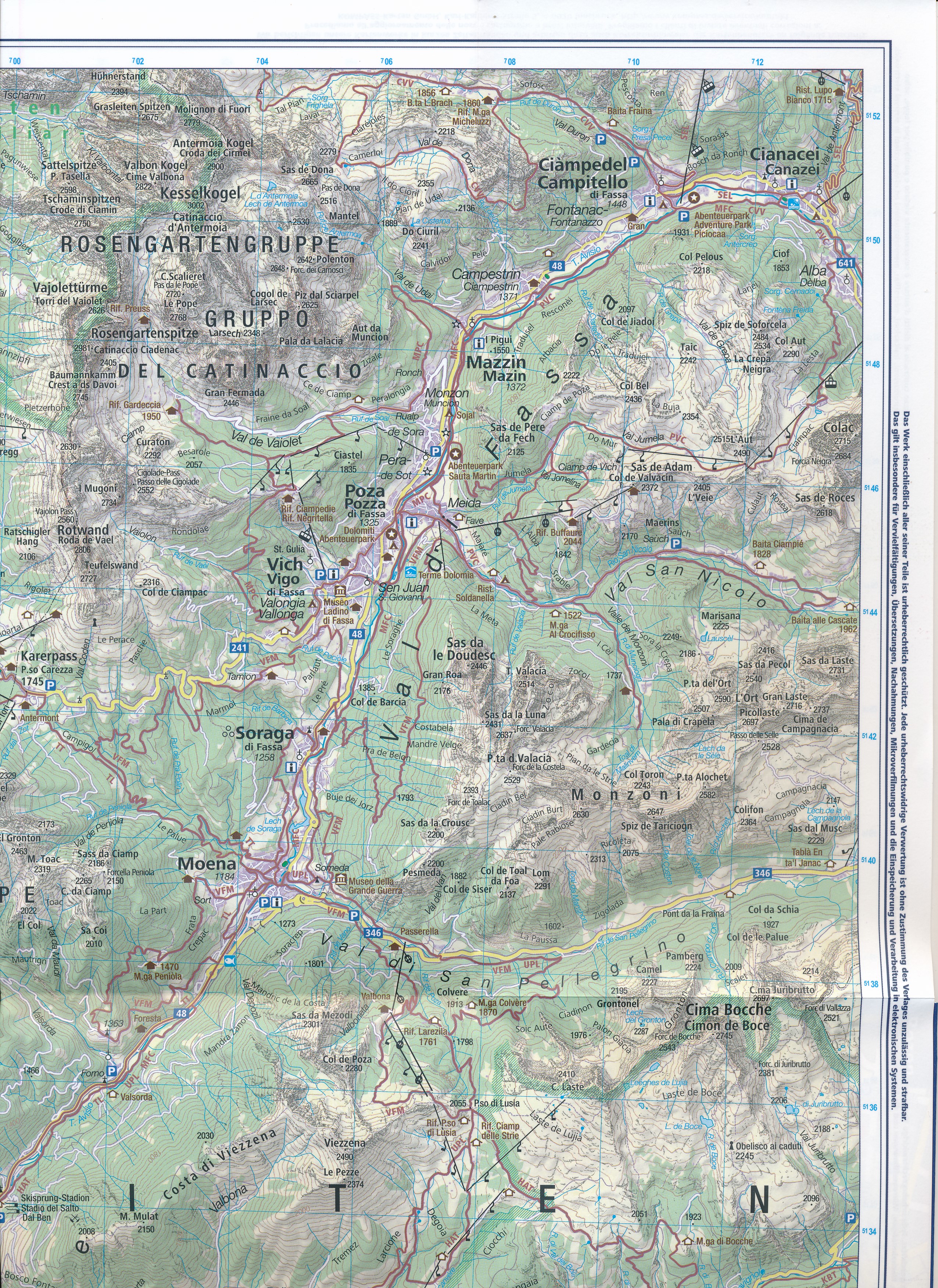 Komplete duidelijke fietskaart van het uitdagende deel van de Dolomieten. . Op scheur- en watervast papier staan de fietsroutes helder ingetekend. Daarnaast praktische informatie als campings , fietsenmakers, bezienswaardigheden en topografische details. Veel wordt met symbolen aangeduid. De schaal is goed: 1:70.000 is uitermate geschikt voor fietstochten.