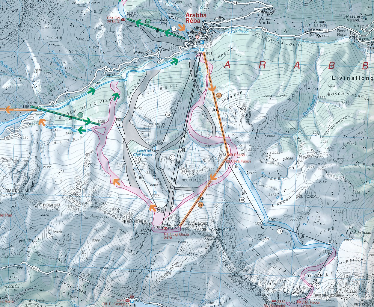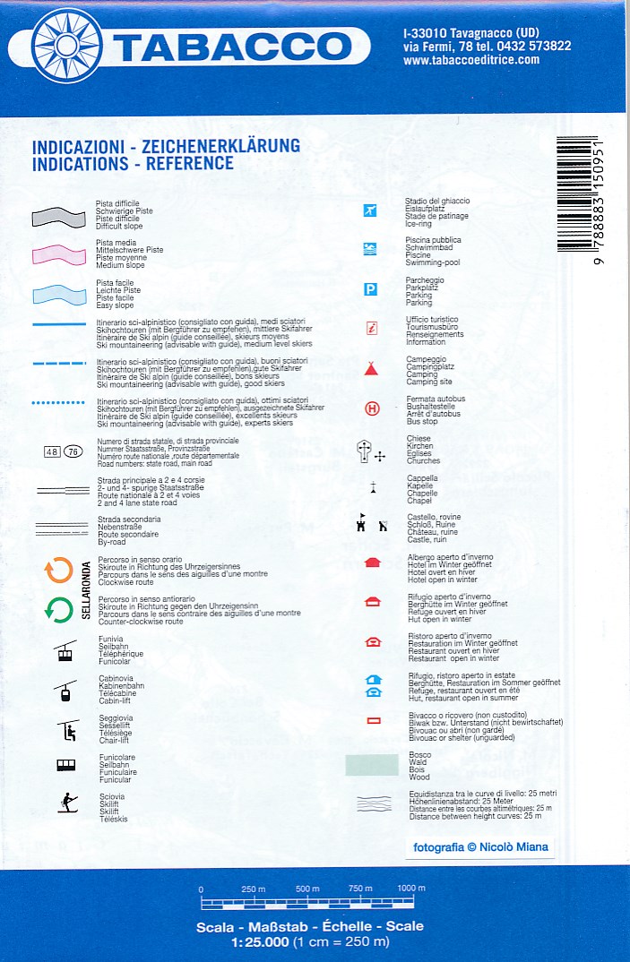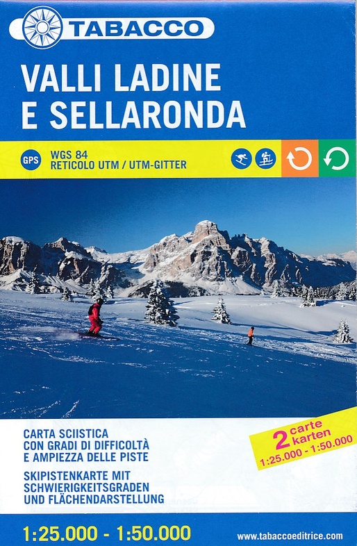 De kaartjes die je in Italië bij de skilift krijgt zijn niet heel duidelijk en bestrijken steeds maar een deeltje van dit gebied. De Tabacco kaart is heel overzichtelijk en onmisbaar als je door het hele gebied wilt skiën. Fijn dat de grotere 1:50.000 kaart weer achterop staat. De kaart is niet in perspectief getekend maar gewoon van bovenaf, je ziet de werkelijkheid. De bergen zijn heel goed aangegeven met kleuren, schaduwen en hoogtelijnen. Alle pistes, liften en skiroutes staan erop. Ook de wegen, hutten en dorpjes. Tip er is een schitterende toertocht,de "Gibirgsjäger" tour.