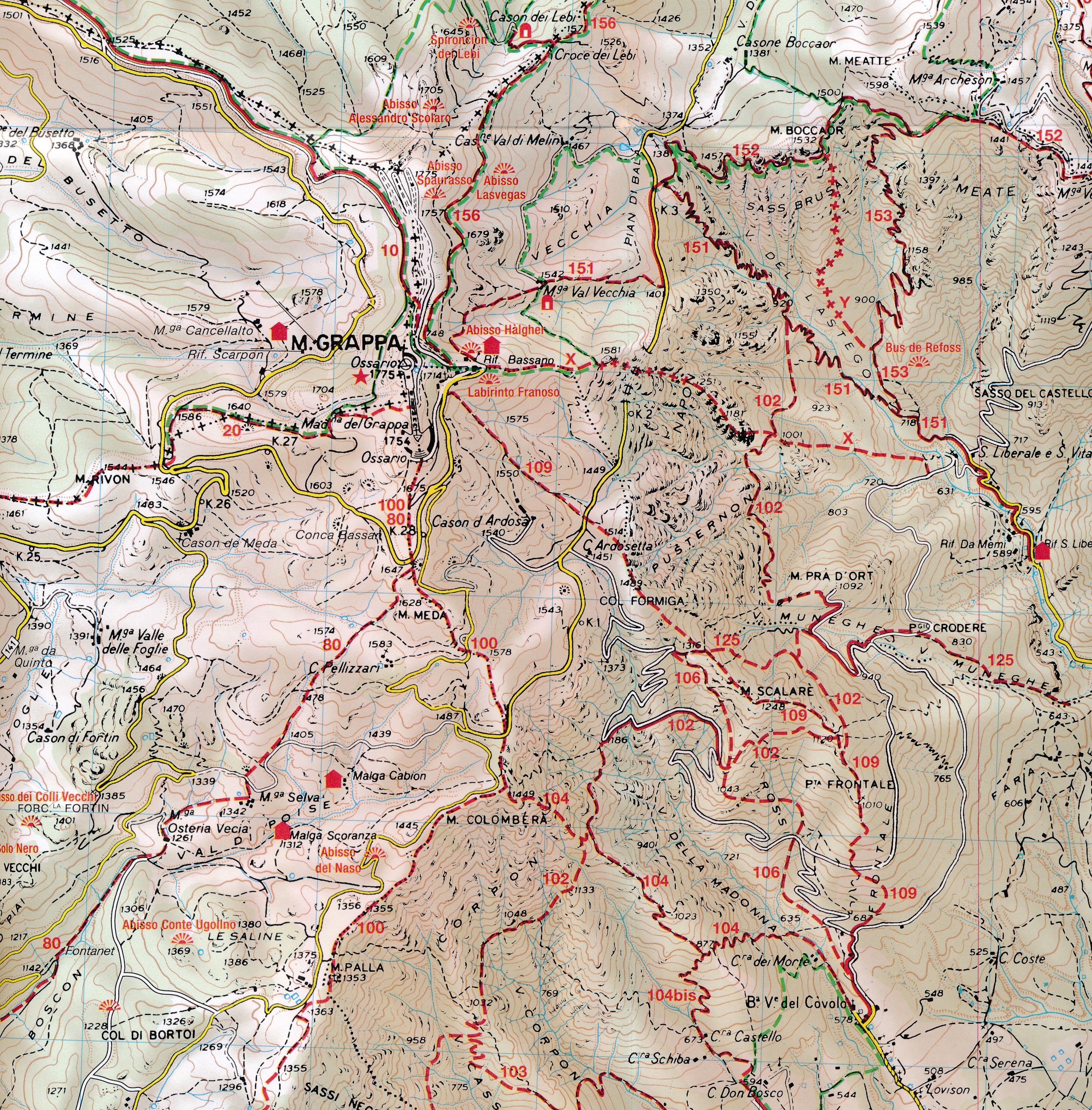 Topografische kaart van het massief rond Monte Grappa in de Dolomieten. Zeer gedetailleerd met alle topografische details, daarnaast zijn op deze kaart de wandelroutes ingetekend. Ook vind je campings, berghutten en bivak's terug op de kaart.