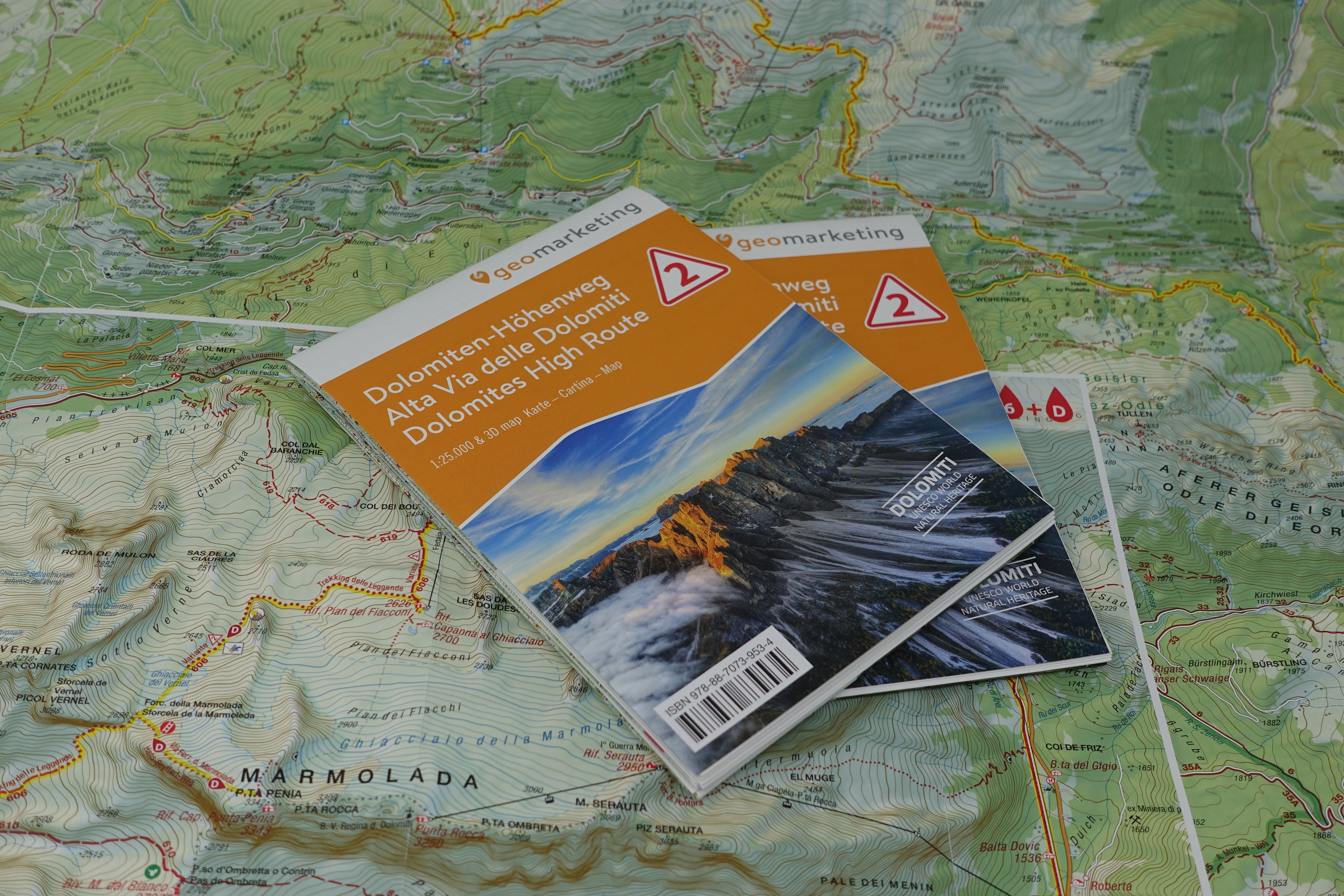 Uitstekende wandelkaart van de hele Alta Via 2 op 1 kaart met hoogte profilelen per etappe.