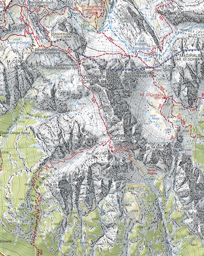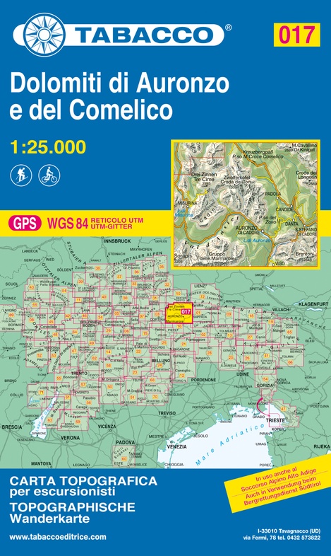 De beste wandelkaarten voor de Dolomieten. Zeer veel topografische details met secure hoogtelijnen (25 meter interval), helder kleurgebruik en bijna alle Tabacco kaarten hebben een UTM grid (voor GPS toepasbaar).