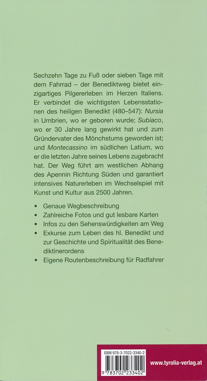 300 km lange pelgrimstocht in de voetsporen van de heilige Benedictus - wandelgids en fietsgids over de pelgrimsroute, die de belangrijkste plekken waar Benedictus heeft geleefd met elkaar verbindt . De Benedictusweg voert door Lazio en Umbrië van Nursia via Subiaco naar Montecassino.