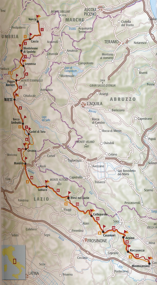 Der 300 Kilometer lange Pilgerweg (16 Etappen) führt durch jahrtausendealte Kulturlandschaft und abwechslungsreiche Natur am Fuße der Apenninen: von Nursia, im Nationalpark Sibillinische Berge gelegen, geht es über das franziskanische Poggio Bustone in das Rieti-Tal, auf alten Schmugglerpfaden weiter ins Aniene-Tal und vorbei an mittelalterlichen Burgen und Abteien nach Subiaco, das unweit der Grenze zu den Abruzzen am Rande des Naturparks Monti Simbruini liegt. Am Südhang der Monti Ernici führt der Pilgerweg weiter ins Liri-Tal und durch Arpino (die Heimatstadt des Cicero) sowie Roccasecca (die Heimat des Thomas von Aquin) nach Montecassino, der berühmten Abtei, die vier Mal zerstört und vier Mal wieder aufgebaut worden war.